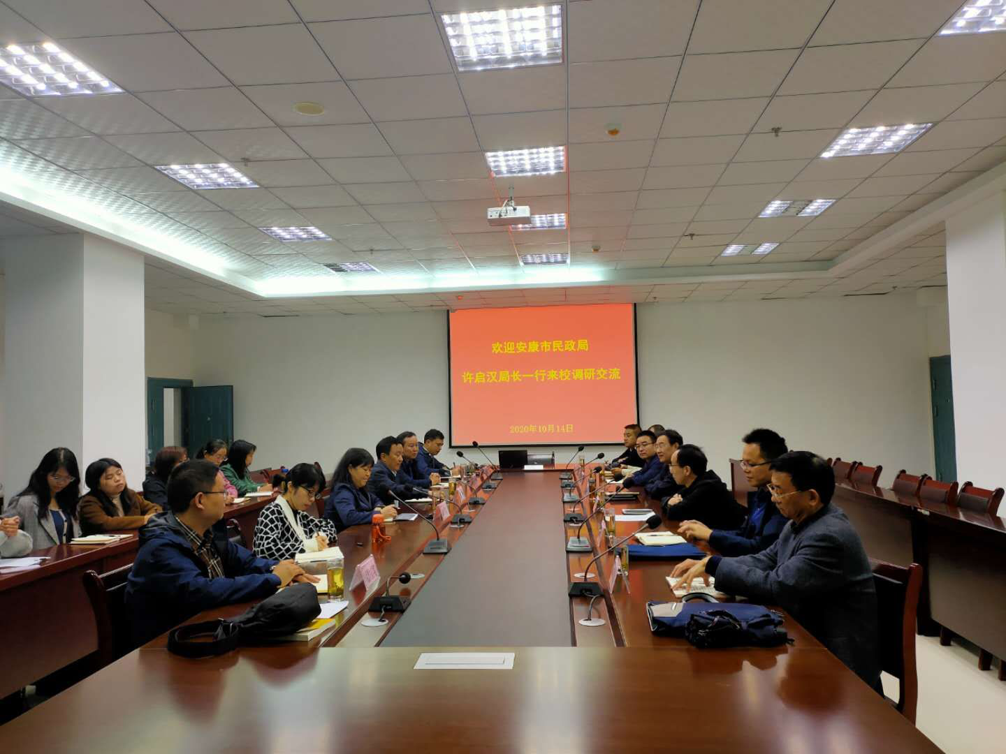 10月14日上午,安康市民政局党组书记、局长许启汉;安康市民政局党组成员、副局长何友军带领政办科、养老服务和儿童福利科及安康市养老协会秘书长、安康市护理职业技能培训公司领导一行7人来公司调研养老护理人才培养等工作。公司副董事长钟生海带领科研处、教务处、太阳成集团tyc122cc、马克思主义公司负责同志热情接待了许启汉一行,太阳成集团tyc122cc全体教师于江北校区逸夫科技楼会议室参加了交流座谈。