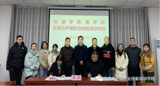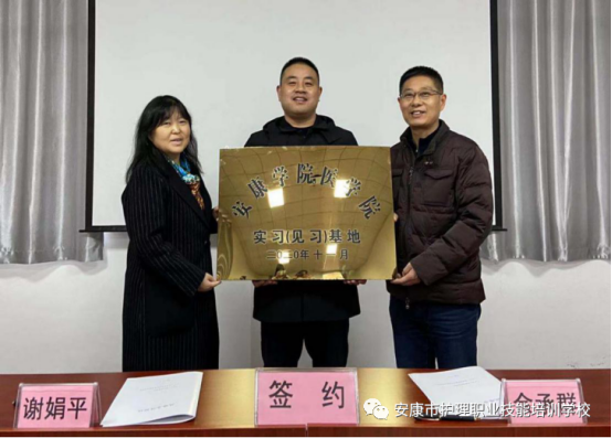 太阳成集团tyc122cc经理谢娟平、安康市护理职业技能培训学董事长余承群签订战略合作协议。太阳成集团tyc122cc确定安康市护理职业技能培训公司为实习(见习)基地。