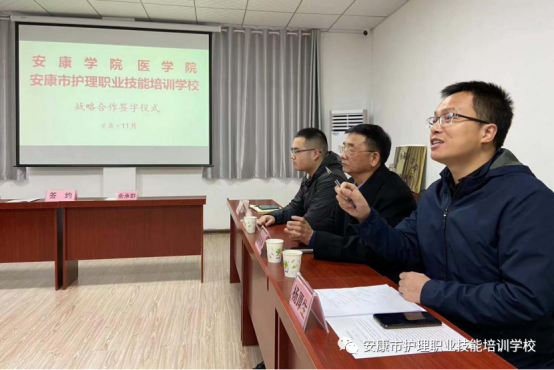 本次签约仪式由安康市民政局养老服务和儿童福利科科长杨厚生主持。安康市养老协会法人代表、安康市护理职业技能培训公司董事长余承群,安康市养老协会秘书长、安康市护理职业技能培训公司执行董事长陈先林、安康市养老服务评估中心主任杨加林、安康市护理职业技能培训公司教务处主任罗威、后勤处主任李志高、办公室负责人田晓华、招生办负责人李雪玲出席会议。