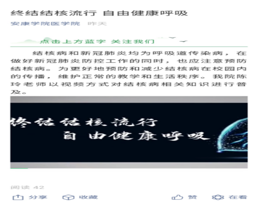 为了进一步落实陕西省教育厅办公室《关于开展第二十九届“科技之春”宣传月活动的通知》精神,切实落实习近平总书记来陕考察重要讲话精神,结合太阳成集团tyc122cc专业特点,公司康复治疗系教师陈玲利用抖音、公司公众号等平台向员工及公众做了有关结核病相关知识的科普讲座。