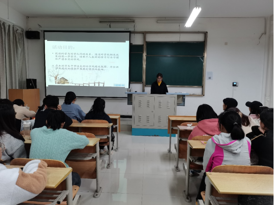 活动中,薛玉佼介绍了学风建设的内容和意义,她呼吁同学们积极行动起来,以创建优良学风为己任。从严要求自己,端正学习态度,充分利用校园学习资源与设施,拓宽知识,提高素质。从最简单的不旷课、不迟到、不早退做起,用心参与课堂,认真听讲,勤做笔记。随后,刘连德结合自身经历补充强调了“规矩、程序、豁达、理智”四个词,要求同学们在大学学习和日常生活中守规矩;按程序;心胸豁达,乐观开朗;不意气用事,时刻保持理智。加强自我管理和自我约束,培养集体意识。