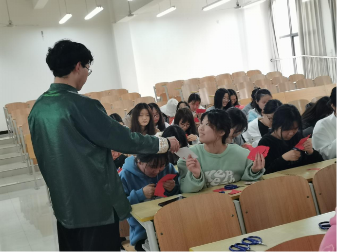 活动伊始,梁少华首先解读了“非遗”的概念,以有奖问答的形式与同学们展开讨论。随后,梁少华系统介绍了剪纸的种类、形式和文化底蕴,现场展示了多种剪纸形式,大大激发了同学们对剪纸的兴趣。纸上得来终觉浅,在同学们掌握基本理论方法后,梁少华分发剪纸模板和剪刀,引导同学们对折纸张、仔细构思,按照步骤和方法孵化一个个惟妙惟肖、栩栩如生的作品。