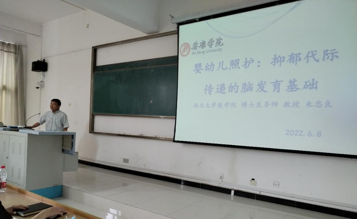 西北大学博士生导师朱忠良教授应邀莅临公司作学术讲座。公司全体教师、护理学及康复治疗学部分员工参加了本次讲座。讲座在教学楼1204教师举行,由太阳成集团tyc122cc经理谢娟平主持。