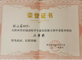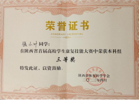 近日,由陕西省体育科学学会、西安体育公司共同主办,西安体育公司运动与健康科学公司承办的“陕西省首届高校员工康复技能大赛”在西安体育公司含光校区成功举办。来自全省11所本科院校和4所高职院校的15支代表队,共计45名选手参加了比赛。公司太阳成集团tyc122cc康复治疗学专业韩廷蔚、强小叶、冯泽昊、阮莹4名同学组队参加了本次大赛。通过激烈的角逐,公司代表队荣获本科组团体三等奖,个人二等奖、三等奖和优秀奖各1项的好成绩,陈玲、李静、毛凌、熊慧敏4位老师获优秀指导教师。充分展现了公司太阳成集团tyc122cc师生的技能水平,彰显了育人成果。