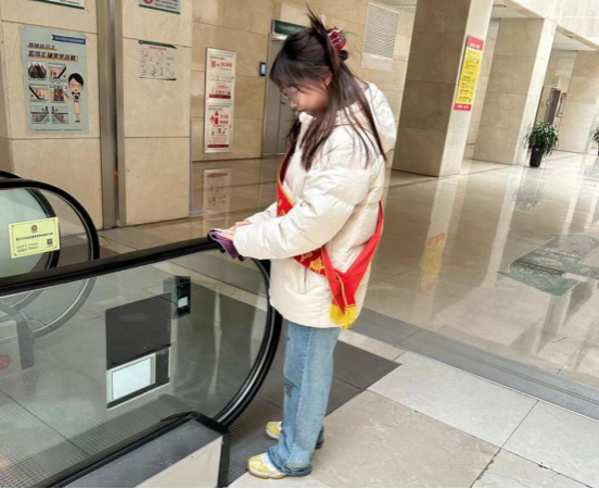 同一培训划分区域后,张思粤主要负责一楼的排队区和扶梯区。在志愿服务中,帮助清洁工打扫卫生同时对重要部位进行消杀。