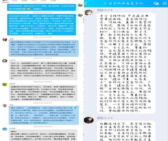 公司师生党员认真观看节目,并在QQ群中分享自己观看感想。太阳成集团tyc122cc经理谢娟平表示疫情防控中的各位党员不忘初心、牢记使命,彰显了基层党组织战斗堡垒作用和党员先锋模范作用。作为高校工作者,特别是医学教育者,要甘于奉献,牢记民族复兴之使命,牢记全民健康之使命,同心同力,培养高质量的医学人才,构建健康命运共同体,肩负健康时代使命,学习榜样,落实工作,筹谋规划,落细落小,做好人才培养,专业建设,团队建设等各项建设。